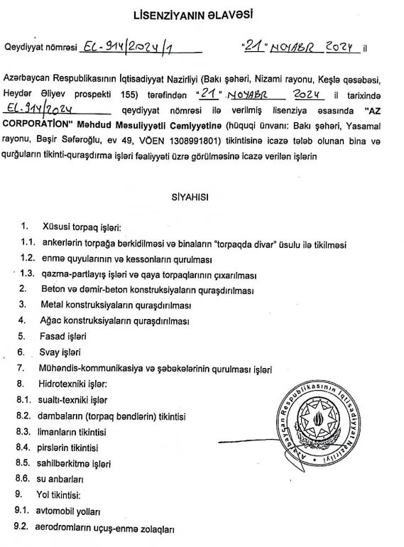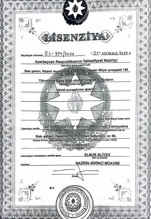 Şirkətimiz Azərbaycan Respublikasının müvafiq dövlət qurumları tərəfindən verilmiş rəsmi lisenziyalar əsasında fəaliyyət göstərən peşəkar tikinti və inşaat şirkətidir. Fəaliyyətimizin əsas məqsədi müasir tikinti standartlarına uyğun, təhlükəsiz və uzunömürlü layihələr icra etməklə müştərilərimiz üçün dayanıqlı investisiya dəyəri yaratmaqdır.